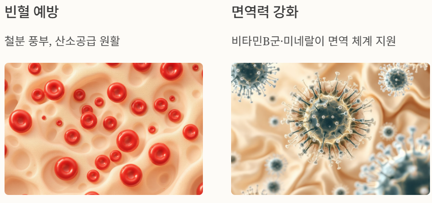 칼륨, 철분, 칼슘 등 필수 미네랄이 풍부해 면역력 유지와 피로 회복에 효과가 있습니다. 특히 감기나 환절기 면역 관리에 좋습니다.