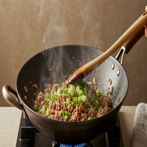 - 팬에 고추기름을 두르고 대파와 고기를 볶아줍니다. 고기의 잡내가 사라질 때까지 충분히 익혀주세요.