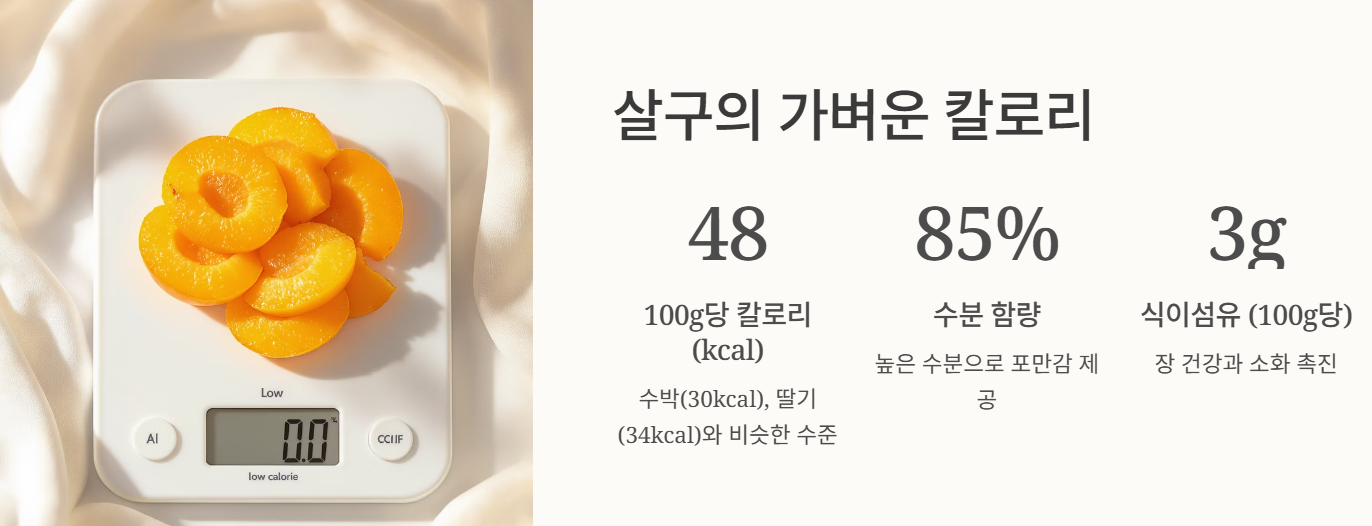 살구는 100g당 약 48~50kcal로, 매우 저칼로리 과일에 속합니다. 수박(30kcal), 딸기(34kcal)와 비슷하거나 약간 높은 수준이며, 포만감에 비해 칼로리가 낮아 다이어트 중에도 부담 없이 즐길 수 있습니다.