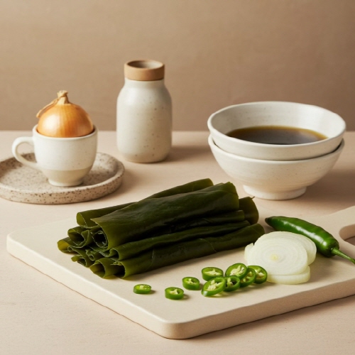 - 불린 미역 120g, 양파 1/3개, 청양고추 2개