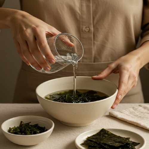- 미역은 불려서 깨끗이 씻고 자른다.