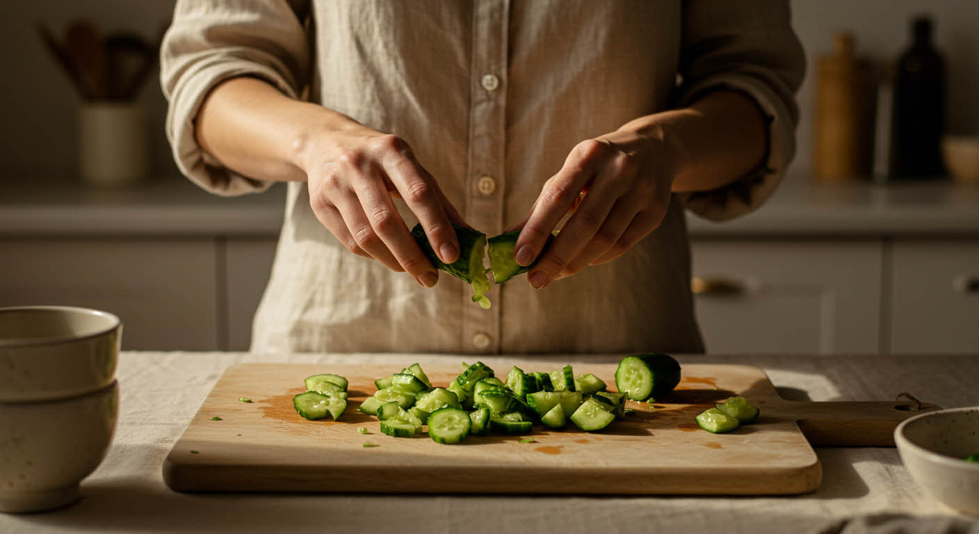 오이는 굵은 소금이나 베이킹소다를 이용해 겉면을 문질러 닦은 뒤, 흐르는 물에 깨끗하게 세척해 주세요. 잔여 농약이나 껍질의 미세먼지까지 말끔하게 제거됩니다.