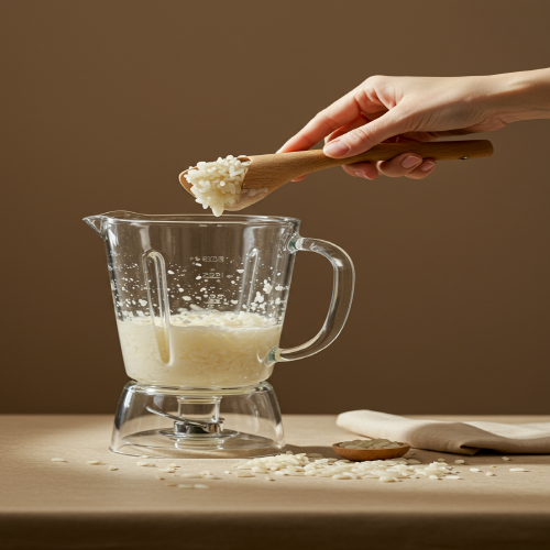 멥쌀은 2시간 이상 충분히 불린 후 물기를 빼주세요. 쌀을 갈아서 사용하면 더욱 부드러운 식감의 죽을 만들 수 있습니다.