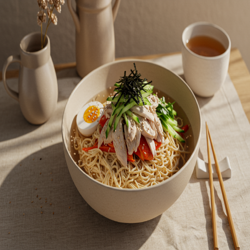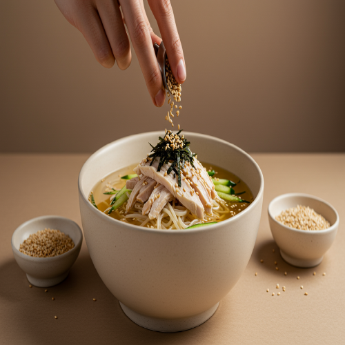 - 면→육수→닭고기→채소 고명 순으로 올립니다.