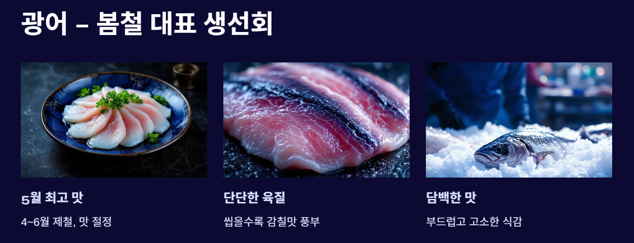 광어는 4월부터 6월까지 살이 통통하게 오르고, 담백하면서도 고소한 맛이 절정을 이룹니다. 특히 5월의 광어는 육질이 단단하고 씹을수록 감칠맛이 풍부해 생선회로 인기가 높습니다.