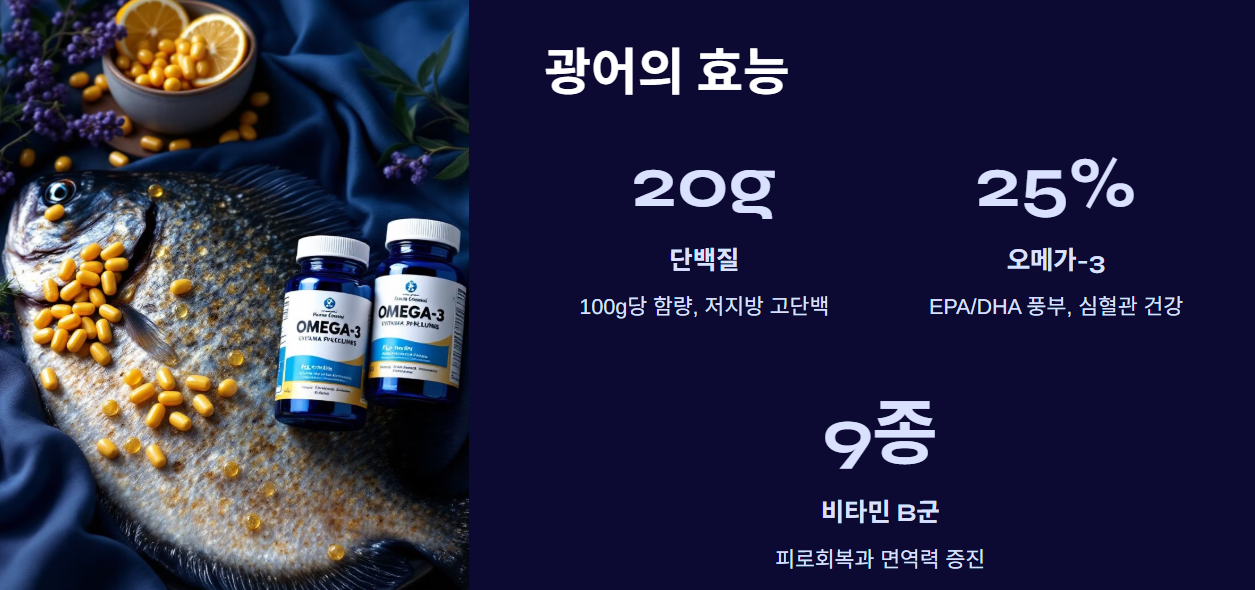 - 고단백, 저지방 식품: 광어는 지방이 적고 단백질이 풍부해 다이어트와 근육 강화에 좋습니다.