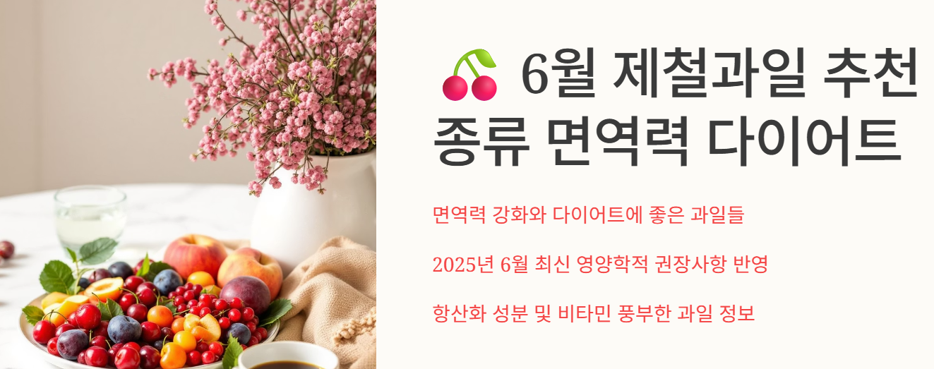 날씨가 점점 더워지며 본격적인 여름의 시작을 알리는 6월, 우리 몸도 계절에 맞춰 변화가 필요합니다. 특히, 면역력 관리와 건강한 몸매 유지를 위한 식단은 필수! 오늘은 6월 제철과일 추천 종류와 함께 면역력 강화, 다이어트 효능까지 꼼꼼히 살펴보겠습니다.